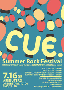 【cue.】とは、ライブ感覚で参加できる邦楽を軸にしたROCK DJ PARTY。福岡県拠点に開催。ライブ感覚で参加できるため初心者の方や一人参戦の方も多い。夕方から終電の時間帯での開催なのでどなたでも参加できる。途中から来たり、途中で抜けても問題ない。楽しみ方は自由で好きな音楽で踊ったり、お酒やソフトドリンクを飲みながら会話を楽しんだり、ゆったり音楽を聴いたりと様々な楽しみ方ができるイベントである。