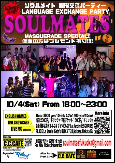 Hi everyone this is Chuck and Sayho from CC Cafe!! We are happy to announce that on 10/4 we will host our fourth Language and Culture exchange party Soulmates !!!! And since the date is very close to Halloween the theme will be a Halloween masquerade party so everyone please be sure to bring a mask!!(for those who forget to bring one we will be selling masks for 200yen) Also besides our regular Live performances and games we will set up the popular game Beer pong for everyone to enjoy so please don't miss out!! See you all very soon!!