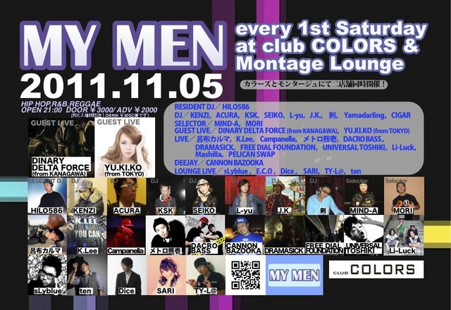 11/5(Sat) MY MEN vol.128 @COLORS&Montage Lounge 11月5日(土) MY MEN vol.128 @CLUB COLORS&Montage Lounge(カラーズとモンタージュにて二店舗同時開催!!) HIP HOP,R&B,REGGAE OPEN 21:00/DOOR ¥3000/ADV ¥2000(共に入場時別途1DRINK ¥500必要です)