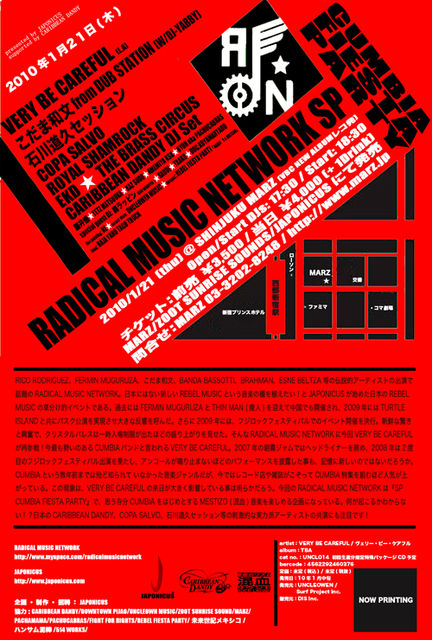 RICO RODRIGUEZ、FERMIN MUGURUZA、こだま和文、BANDA BASSOTTI、BRAHMAN、ESNE BELTZA等の伝説的アーティストの出演で話題のRADICAL MUSIC NETWORK。日本にはない新しいREBEL MUSICという音楽の種を植えたい!とJAPONICUSが始めた日本のREBEL MUSICの草分け的イベントである。過去にはFERMIN MUGURUZAとTHIN MAN (痩人)を迎えて中国でも開催され、2009年にはTURTLE ISLANDと共にバスク公演を実現させ大きな反響を呼んだ。さらに2009年には、フジロックフェスティバルでのイベント開催を決行。新鮮な驚きと興奮で、クリスタルパレスは一時入場制限が出たほどの盛り上がりを見せた。そんなRADICAL MUSIC NETWORKに今回VERY BE CAREFULが再参戦!今最も勢いのあるCUMBIAバンドと言われるVERY BE CAREFUL。2007年の朝霧ジャムではヘッドライナーを務め、2008年は2度目のフジロックフェスティバル出演を果たし、アンコールが鳴り止まないほどのパフォーマンスを披露した事も、記憶に新しいのではないだろうか。CUMBIAという数年前までは殆ど知られていなかった音楽ジャンルだが、今ではレコード店や雑誌がこぞってCUMBIA特集を組むほど人気が上がっている。この現象は、VERY BE CAREFULの来日が大きく影響している事は明らかだろう。今回のRADICAL MUSIC NETWORKは『SP CUMBIA FIESTA PARTY』で、思う存分CUMBIAをはじめとするMESTIZO (混血)音楽を楽しめる企画になっている。何が起こるかわからない!?日本のCARIBBEAN DANDY、こだま和文、COPA SALVO、石川道久セッション等の刺激的な実力派アーティストの共演にも注目です!