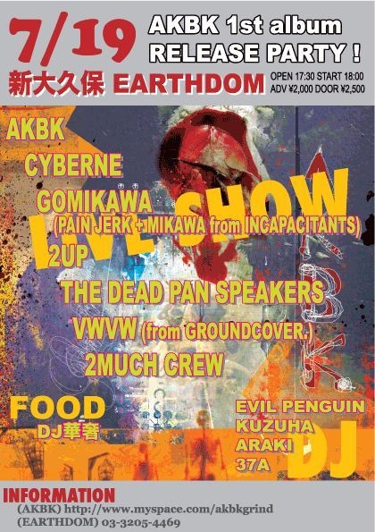 "AKBK is a non-stop terrorist attack in the brain, a fast brutal beating on the head, like being crushed by a mountain: please send help!!!!!" Rich Hoak / Brutal Truth, Total Fucking Destruction "Typical of the Japanese- always taking everything to the extreme. This album is like a prog rock grind metal excursion. always interesting and at all times punishing" Jason P.C. / Blood Duster, Goatsound Recording "Intense amalgam of progressive grindcore and extreme metal. Growling vo-kills and killer riffs. The best grind I've heard in some time. I want AKBK to play in my funeral." Lasse Marhaug / Jazkamer "グラインドってノーベル賞ものだよね。ブラストいれてりゃなんでもよし! グラインドは気概で出来ている魂の音楽。GRIND=AKBK" analtoshit / Obliteration Record, BUTCHER ABC "Noise GigoloとDirkschnoiseのツイン・ギターは、まるでアル カーイダとCIAの共同軍事作戦である。Hard PuncherとAnal Backfireのリズム・セクションは、NASAとヴェガ星人による共同ブラックホール探査だ。Judas Preacherの地獄の咆哮は 、ネフィリムの増殖を促す。 全世界のオーガズム・アディクトに捧げるアンストッパブル・デス・レース、AKBK!" Mitsuru Tabata / Zeni Geva, Leningrad Blues Machine, Acid Mothers Temple, Amazon Saliva, etc.