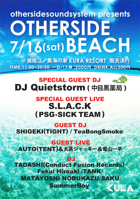 07/TEKNIVAL,08/WHO'S PARK,10/新島WAX,etc 様々な野外Partyを行ってきたOther Side Sound System (http://othersidesoundsystem.tumblr.com/)が 今年の夏は江の島のKULA RESORTでPartyを開催します!