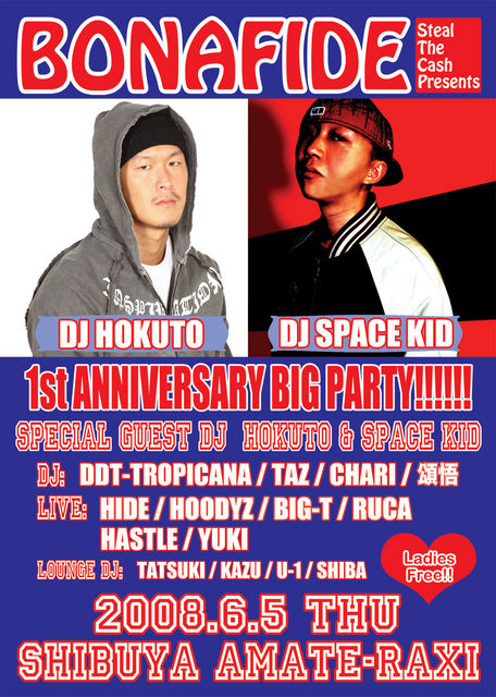 BONAFIDE〜1st ANNIVERSARY〜 @渋谷Amate-Raxi 2000yen/1D 1500yen/1D(w/f) Ladies FREE!!! 2008/6/5(THU) OPEN 23:00