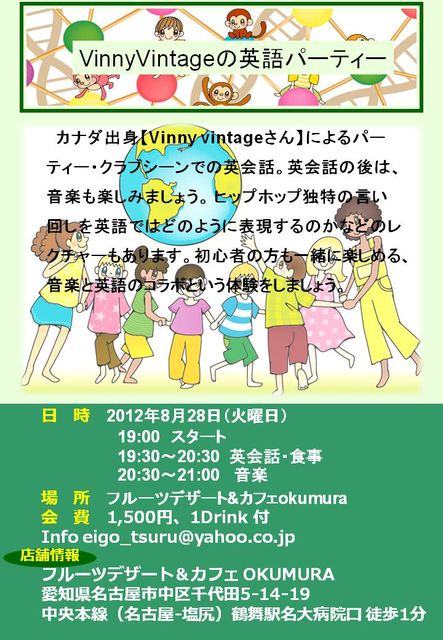 英語大好き、音楽大好きさんをVinnyVintage英語パーティーに招待しますわーい(嬉しい顔)
