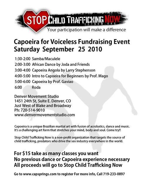 Capoeira is unique Brazilian martial art with fusion of dance, music and acrobatic movements. It is challenging art form to stretch your body, mind and soul. Come learn to play Capoeira. It is so much fun. There will be various types of Capoeira workshops by guest instructors. For $15, take as many classes you want. All the proceeds will go to non-profit organization, STOP CHILD TRAFFICKING NOW. 1:30PM SAMBA/MACULELE 2:00PM AFRICAN DANCE 3:00PM CAPOEIRA ANGOLA 4:00PM INTRO TO CAPOEIRA 5:00PM CAPOEIRA 6:00PM RODA (CAPOEIRA PLAY) Come join the fun, and be part of the SOLUTION!!!!!!!!!