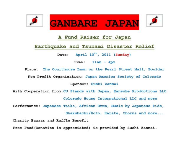 A Fund Raiser for Japan Earthquake and Tsunami Disaster Relief Date: April 10th, 2011 (Sunday) Time: 11am – 4pm Place: The Courthouse Lawn on the Pearl Street Mall, Boulder Non Profit Organization: Japan America Society of Colorado Sponsor: Sushi Zanmai With Cooperation from:CU Stands with Japan, Kansuke Productions LLC Colorado House International LLC and more Performance: Japanese Taiko, African Drum, Music by Japanese kids, Shakuhachi/Koto, Karate, Chorus and more... Charity Bazaar and Raffle Benefit Free Food(Donation is appreciated) is provided by Sushi Zanmai.