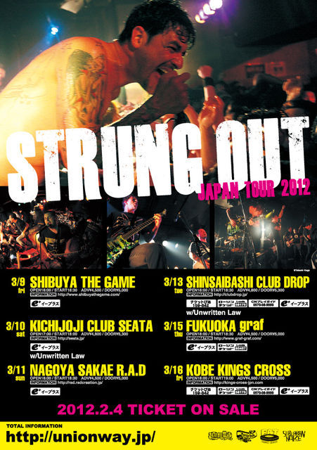 衝撃の来日から2年!様々なメロディック/パンクバンドにも影響を与え、リスペクトされるSTRUNG OUTの来日が今年3月に決定しました!さらに今回は待望の福岡公演も決定です! さらに、STRUNG OUT JAPAN TOUR 2012の吉祥寺CLUB SEATAと大阪心斎橋CLUB DROPには、エモーショナル&ポップ・センスが光るカリフォルニア・ロックの代表バンドUnwritten Lawも共演! チケットは絶賛発売中です!宜しくお願いします!