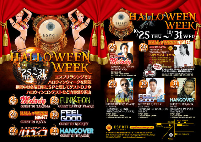 毎週火曜日、日本屈指の眠らないインターナショナルな町六本木の駅から1分と好立地にある高級ラグジュアリーCLUB店、"ESPRIT LOUNGE" にてBIG PARTY "FEEL GOOD HALLOWEEN SPECIAL" 開催☆