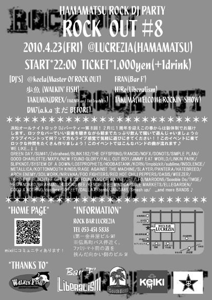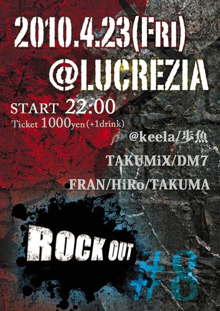 ROCK OUT#8 2010/4/23(FRI) @LUCREZIA(HAMAMATSU) START*22:00[ALLNIGHT] DOOR*1,000yen(+1drink order) 【DJ'S】 @keela,歩魚,TAKUMiX,HiRo,TAKUMA