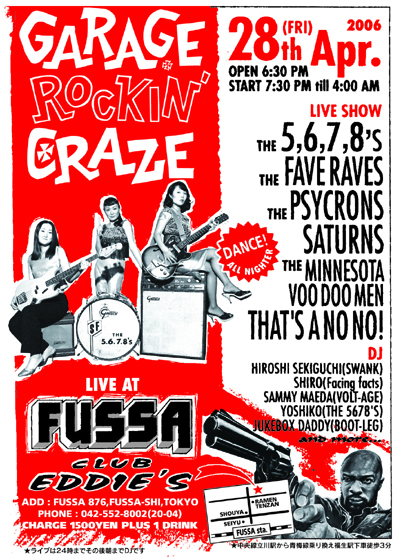 2006年4月28日(祭日前金曜日) Garage Rockin' Craze 出演 THE 5.6.7.8'S THE FAVE RAVES THEサイクロンズ SATURNS THE MINNESOTA VOO DOO MEN THAT'S A NO NO! DJ HIROSHI SEKIGUCHI(SWANK) SHIRO(Facing facts) サミー前田(VOLT-AGE) YOSHIKO(THE 5678'S) JUKEBOX DADDY(BOOT-LEG) and more... 時間 6:30PMオープン、7:30スタート *ライブは24時までその後朝までDJです 料金 1500円+1ドリンク 場所 CLUB EDDIE'S 東京都福生市福生876 TEL 042-552-8002(20〜04) *中央線立川駅から青梅線乗り換え福生駅下車徒歩3分