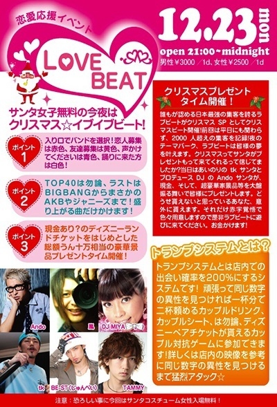 開催終了12/23日はラブビート@渋谷キャメロット!サンタコスの女性は無料でご入場!【特別ディスカウント 価格】男性2000/1D、女性1500/1Dでご招待!