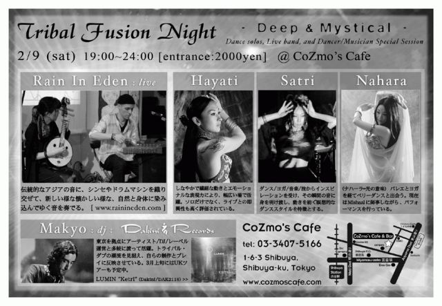 Hi, I'm Kelly from RainInEden. On behalf of Megumi and Herman, I would like to invite you to join us for our first show in 2008. We are joining Makyo's wonderful dance and music event "Tribal Fusion Night" at Cozmos Cafe in Shibuya. I hope you can join us for an evening of exotic sights and sounds and help us start off a new year of musical and creative journeys along the silk Road.