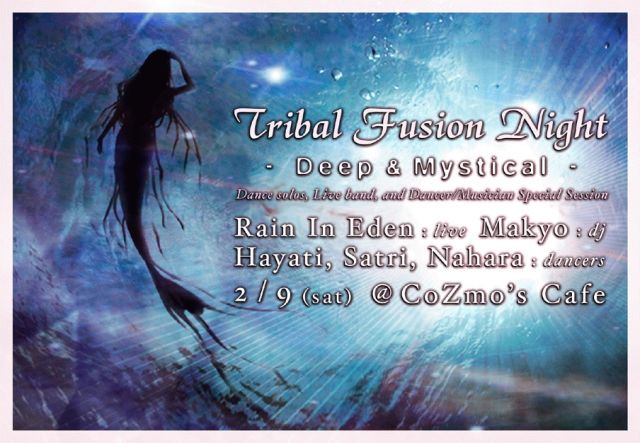Tribal Fusion Night is dedicated to exploring new, progressive directions in bellydance. While there are dozens of events featuring Oriental bellydance in Tokyo, TFN looks for more modern, eclectic approaches: Tribal, Tribal Fusion, Mystic, and more. Each month features two or three different dancers, performing to both recorded and live music in an intimate setting. "Jam sessions" between the dancers and musicians are encouraged, and various fresh musical combinations are attempted: koto vs. arabic percussion, didgeridoo and djembe, oud & electronics.