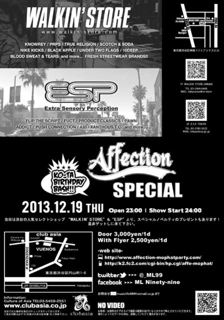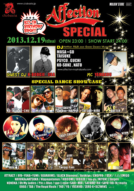 東京のダンスシーンをリードし続け、平日にも関わらず毎回盛り上がりをみせているパーティー『Affection』 今年ラスト、スペシャルでの開催です!! そして今回はKO-TA(HIPNOTIC BOOGIE/Monster) BIRTHDAY BASHとしても開催!!0時を過ぎるとリアルバースデーを迎えるので祝杯です!! 全てが見逃せない超豪華出演者が決定しました!! ダンスショーケースには日本が世界に誇るトップダンサー、そして見逃せない注目のダンサーが出演!! GUEST DJにはK-BOOGIE&OBAが!! そして都内、各地の様々なシーンで活躍している注目のDJ陣が集結!3フロアーを最高のDance Mixで演出します!! MCにはもちろん、YAMAKOU from sinario!! ショーを観るも良し、踊るも良し、BarでChillも良し、様々な形で楽しめる空間を作ってお待ちしています。 熱いサウンドと、迫力のパフォーマンスで、オープンからクローズまでエネルギーを感じる熱い一夜になること間違いなし!「今」を感じられるパーティーに是非足を運んでみるべき! Good Music ! Good Showcase ! and Love & Peace♪