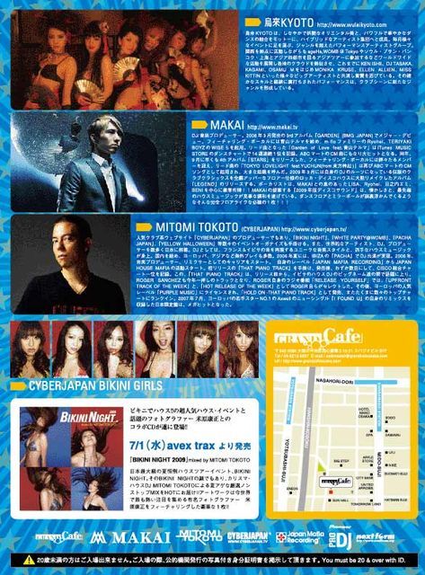 DATE: 2009.06.20(SAT) TITLE: BIKINI NIGHT 2009 feat. pure house GUEST DANCER: 烏來KYOTO BIKINI GIRLS: CYBERJAPAN BIKINI DANCERS DJ: MAKAI MITOMI TOKOTO(CYBERJAPAN) TAKEKIYO(MOMENTS IN SOUL / ACCESS ALL AREA) KAZUYA MASUI YUTO(Sheep) VJ: nextform OPEN: 22:00 DOOR: 3,000YEN/W1D(ビキニ着用の女性の方、入場無料ご招待!) PLACE: GRAND Cafe 06-6213-8637
