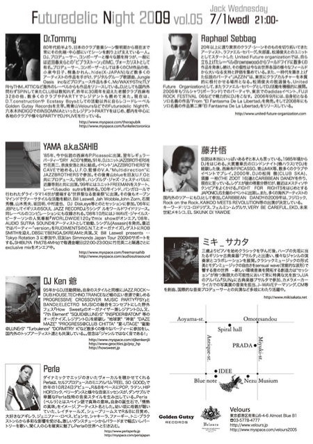 ★Raphael Sebbag(United Future Organization) 20年以上に渡り東京のクラブ・シーンそのものを切り拓いてきたアーティスト、ラファエル・セバーグ。矢部直、松浦俊夫とのユニットとしてスタートしたUnited Future organizationでは、自ら立ち上げたレーベル?Brownswood?からワールドワイドに数多くの作品を発表し続け、その個性は今なお世界各国の様々なフィールドから大いなる支持と評価を集めている。また、一時代を築き上げた伝説のパーティ"JAZZIN'"は、東京にクラブカルチャーを本質的に根付かせる場所となる。松浦俊夫の脱退後も、United Future Organizationとして、またラファエル・セバーグとしてDJ活動を積極的に展開。 2006年もワルシャワ(ポーランド)でのパーティや、東京でのadidasイベント、FUJI ROCK FESTIVAL 06などで精力的にDJをこなす。 2006年9月には、自身初となるソロ名義の作品「From "El Fantasma De La Libertad」を発売。そして2008年にもソロ名義の作品第二弾「El Fantasma De La Libertad」をリリースしている。