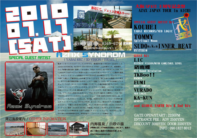 GLOBAL EARTH PRESENTS... Supported By YABAI RECORDS …━…━…━…━… SUMMER DANCE BEACH FESTIVAL 2010 大注目お祭りFESTIVAL 『 大阪 SPACE 3周年記念祭 』 -AZAX JAPAN TOUR in AICHI- http://mixi.jp/view_community.pl?id=4061110 ・・・・・・・・・・…━━━━☆.・.・