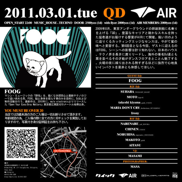 In August 2009, [QD] rose from the depths of Tokyo’s underground. Cutting edge style combined with a professional line up immediately set [QD] apart, and have continued to make it one of the hottest events on the AIR calendar. For its sixth installment, [QD] proudly welcomes FOOG. A dj that has made immeasurable contributions to Japanese house and techno, FOOG's floor-slamming technique has gained him a wide following, and recognition as a truly international-level artist. We certainly hope you will join us for the best Tuesday night event around. See you there!