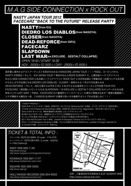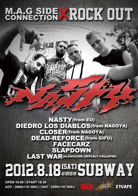 コメント 毎年夏に海外からゲストアーティストを招き行われるHARDCORE JAPAN TOUR!!!今回は、ヨーロッパからNASTYが初来日!そして、そのJAPAN TOUR 1発目がなんと四日市SUBWAYで、三重伝統ハードコアイベントM.A.G SIDE CONNECTIONと名古屋ハードコアイベントROCK OUTとの共同企画にて開催決定!出演バンドも名古屋から久しぶりの出演となるDIEDRO LOS DIABLOS、CLOSER!岐阜からも1年ぶりの出演となるDEAD-REFORCE!そして、地元三重からは今年3月に4年ぶりとなる音源をリリースし只今全国TOUR中のFACECARZ!毎回激しいピットとなるSLAPDOWN!元EXCLUDEとGESTALT COLLAPSEのメンバーからなる超新生バンドLAST WAR!今回は、FACECARZの三重場所リリースパーティーも兼ねて開催されます!東海の最重要バンドが集結する最狂な一夜、この四日市SUBWAYが爆発寸前いや大爆発するライブをお見逃しなく!!!