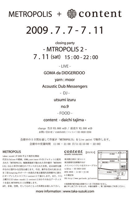 2009/5/15にリリースしたyarn:moor の1stアルバム「So, I'll take your hand and..」のアートワークを手掛けたtakao suzukiの個展MTROPOLIS + contentのクロージングパーティです。