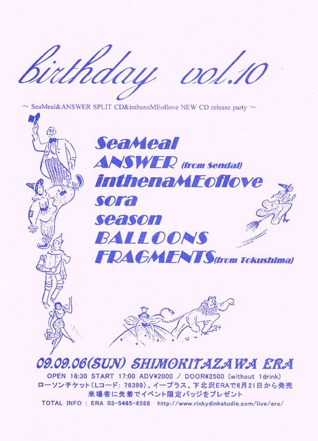 出演バンドは、凛とした佇まいが魅力の仙台の女性メロディックバンドANSWER、近頃は心機一転歌の力を感じさせつつもポストロックmeets パンクの独自サウンドを追求するinthenaMEoflove、激情感と歌心がせめぎ合う切なさ全開のsora、活動休止後初ライブとなる season、ストイックなまでに独自の世界観を追及し続ける色男集団BALLOONS、徳島のLEMON HEADS meets Mary Lou Lordを感じさせるFRAGMENTS、そしてSeaMealの6バンドでお送りします!
