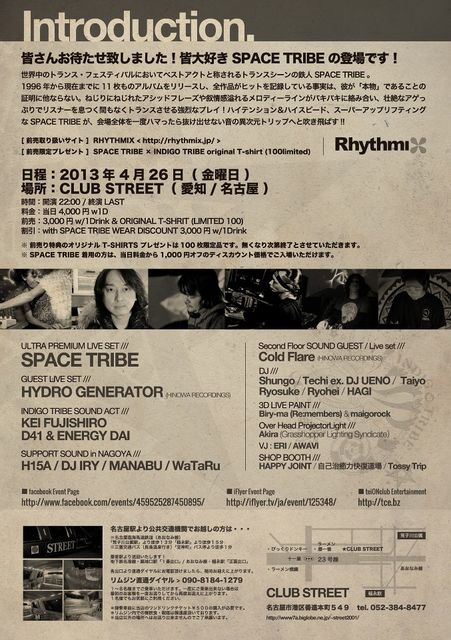 皆さんお待たせ致しました!皆大好き SPACE TRIBE の登場です! 世界中のトランス・フェスティバルにおいてベストアクトと称されるトランスシーンの鉄人 SPACE TRIBE 。1996年から現在までに11枚ものアルバムをリリースし、全作品がヒットを記録している事実は、彼が「本物」であることの証明に他ならない。 ねじりにねじれたアシッドフレーズや叙情感溢れるメロディーラインがバキバキに絡み合い、壮絶なアゲっぷりでリスナーを息つく間もなくトランスさせる強烈なプレイ!ハイテンション&ハイスピード、スーパーアップリフティングな SPACE TRIBE が、会場全体を一度ハマったら抜け出せない音の異次元トリップへと吹き飛ばす!!