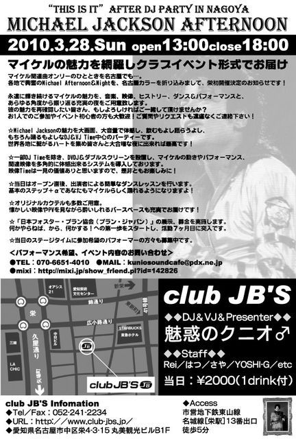 “名古屋Michael Afternoon” 〜『THIS IS IT』 AFTER DJ PARTY in NAGOYA〜 会場:栄club JB'S 052-241-2234 住所:名古屋市中区栄4-3-15 丸美観光ビルB1 http://www.shscity.com/jbs/access/index.html 当日:\2000(1drink付) DJ&VJ&Presenter:魅惑のクニオ♂ VJ:Honest Dance Lesson:YOSHI-G/YU-KI Show Time:アフロシスターズ Staff:Rei/はつ/さや/YOSHI-G/etc